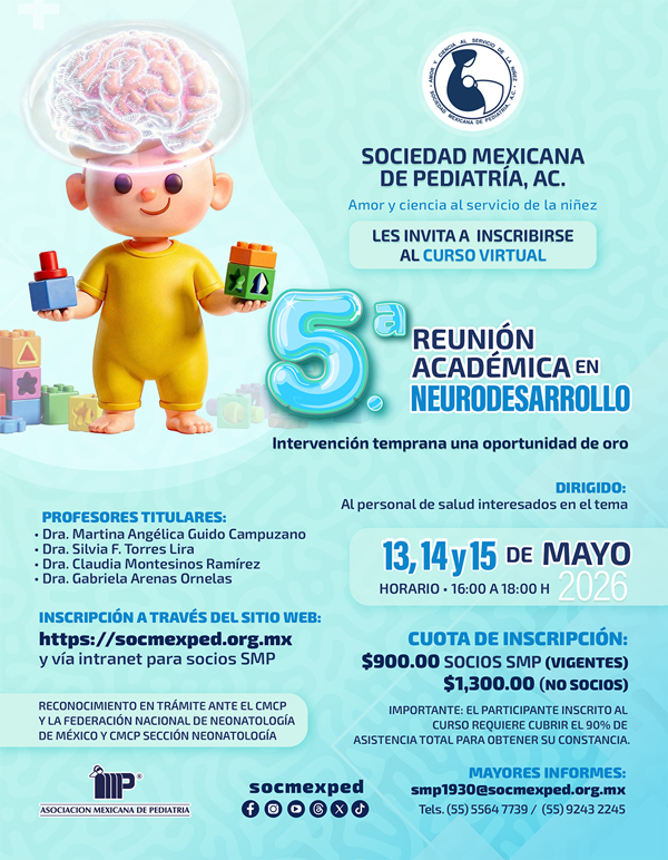 El personal administrativo y la Mesa Directiva 2025-2026 nos esforzaremos por brindarles una atención de calidad y un espacio de constante crecimiento profesional. Aprovechamos esta oportunidad para invitarlos a participar en la 13ª Cumbre Pediátrica de la Sociedad Mexicana de Pediatría, que se llevará a cabo los días 23, 24 y 25 de septiembre del 2026. Este evento será una gran oportunidad para aprender, compartir experiencias y fortalecer nuestra comunidad. Gracias por su confianza y compromiso con nuestra sociedad. Los invito a explorar esta plataforma y a seguir participando activamente en nuestras iniciativas. Juntos, continuaremos avanzando en la noble misión de velar por la salud y bienestar de nuestros niños.