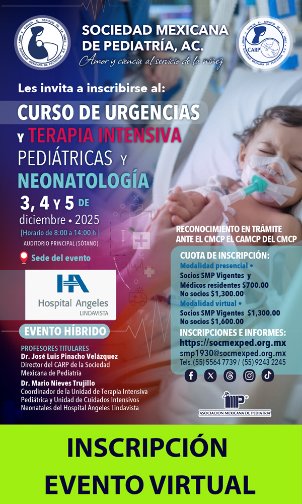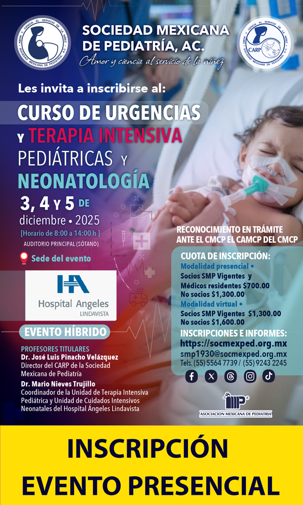 Inscríbete y obtén BECA PRESENCIAL para el Congreso de Urgencias y Terapia intensiva pediátricas y Neonatología organizado por la SMP y el Hospital Ángeles Lindavista a realizarse del 3 al 5 de diciembre del 2025