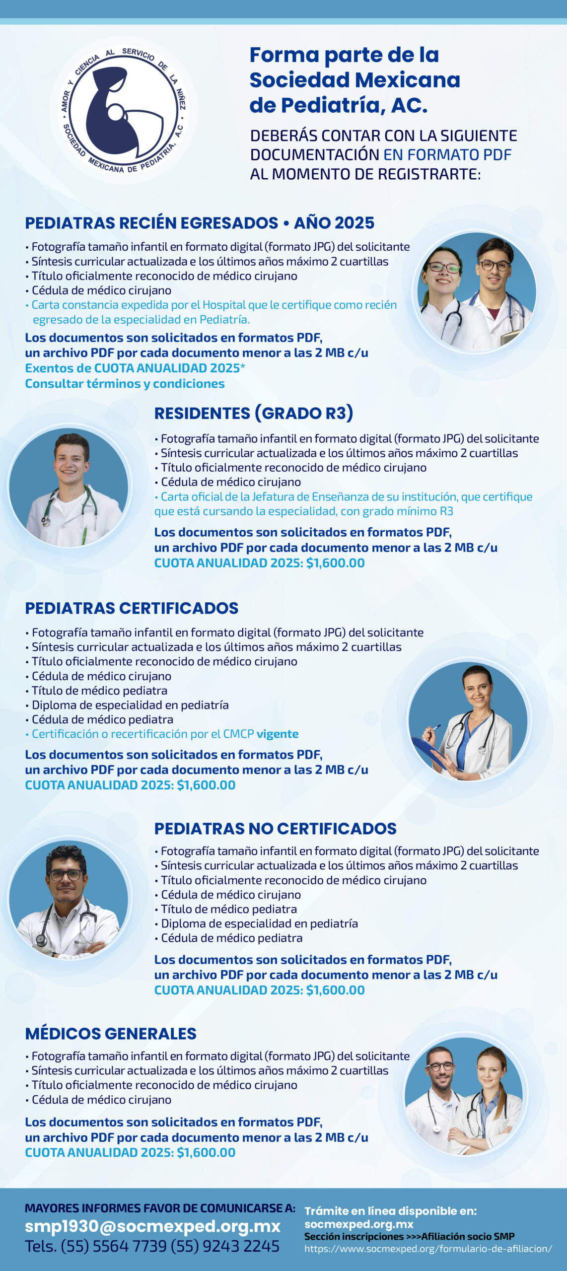 Los socios de la Sociedad Mexicana de Pediatría, A.C. pueden ser médicos pediatras que presenten su debido trámite de inscripción con todos los documentos solicitados vigentes y en orden.